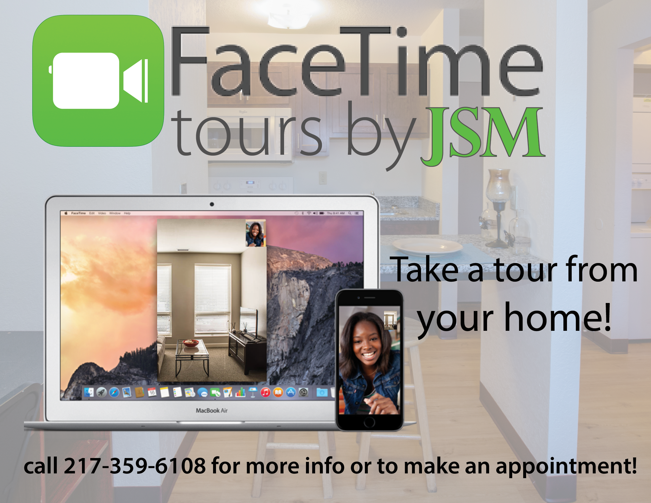 If you are wanting to see a JSM Apartment and are out of the country, state or town you have the option to do a Factime Tour of the apartment live with one of our leasing agents. Call 217-359-6108 or email jsm@jsmliving.com to make an appointment!